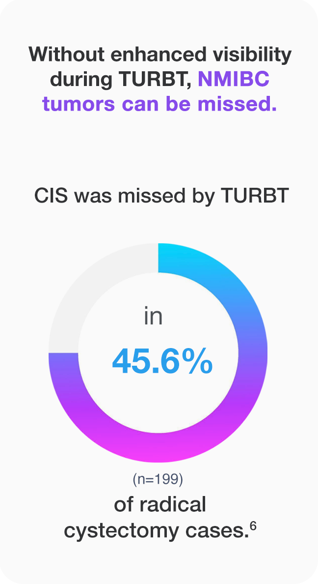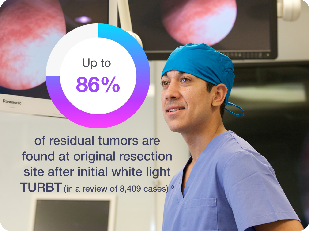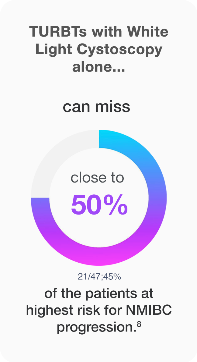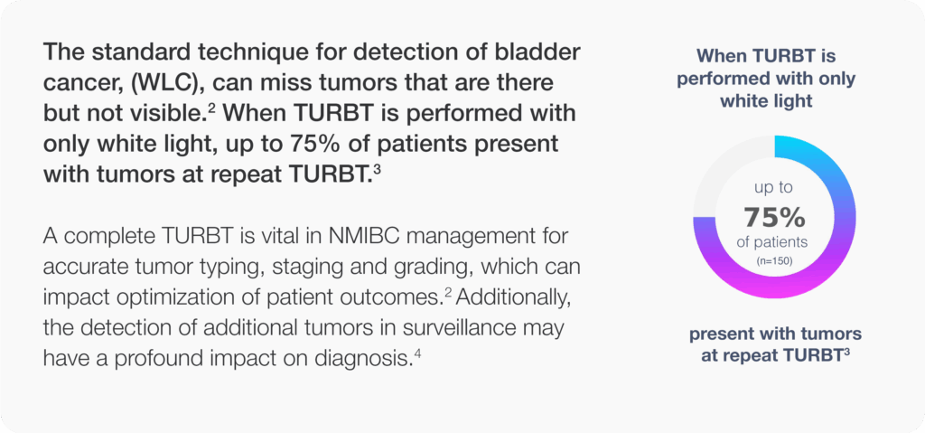 The standard technique for detection of bladder cancer, (WLC), can miss tumors that are there but not visible.2 When TURBT is performed with only white light, up to 75% of patients present with tumors at repeat TURBT.3
