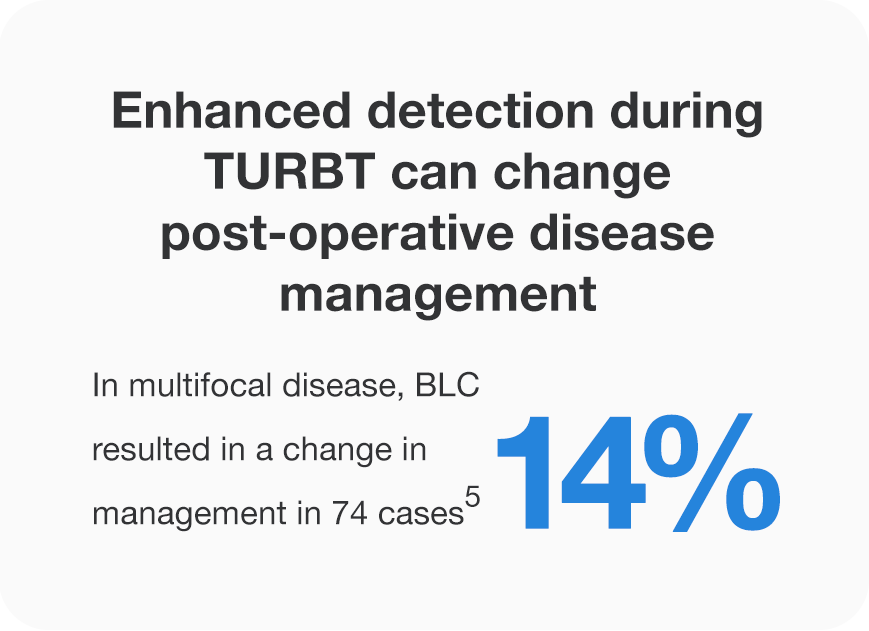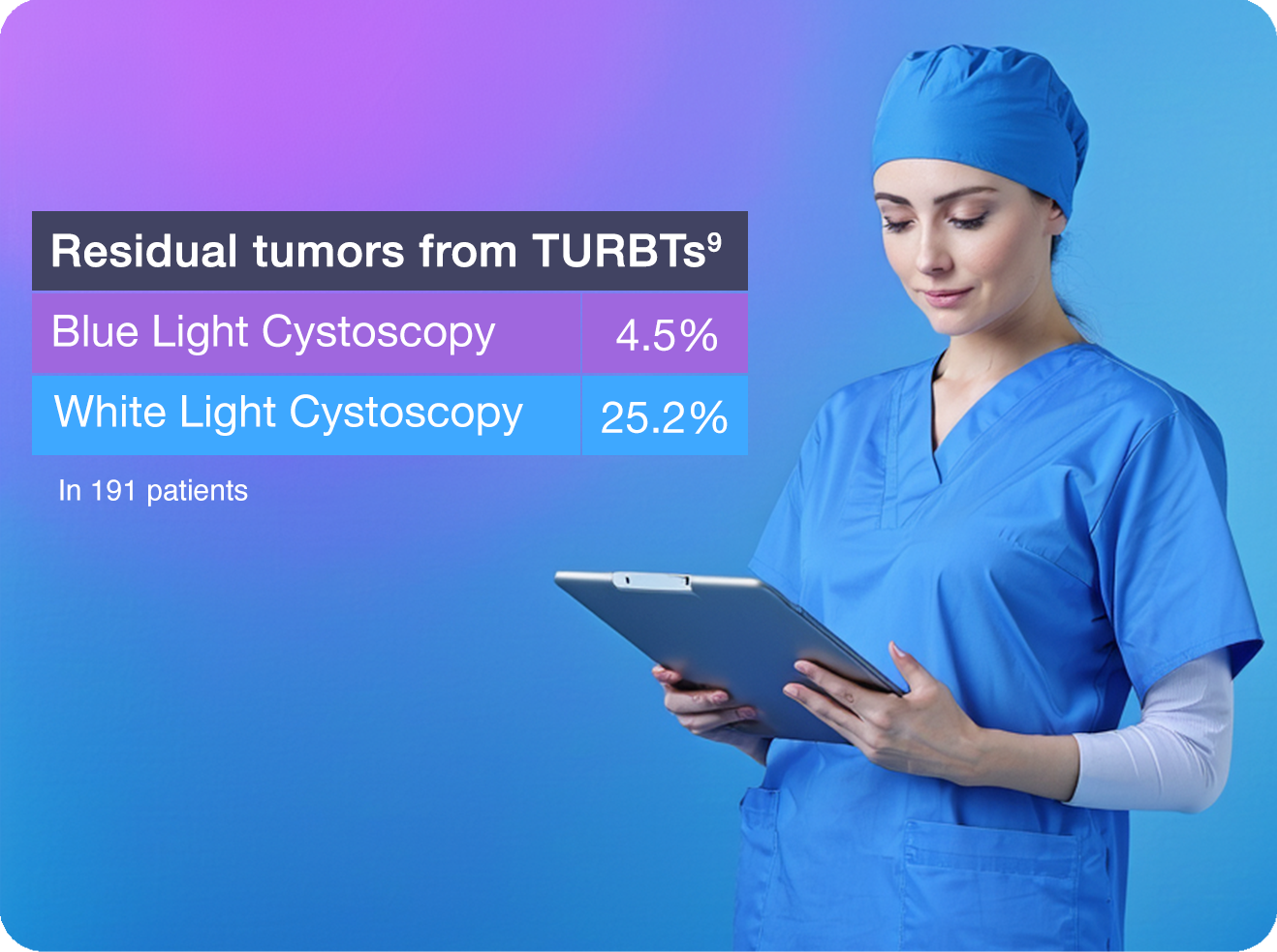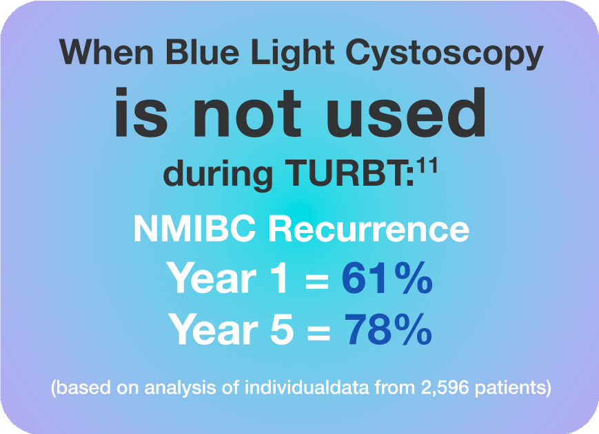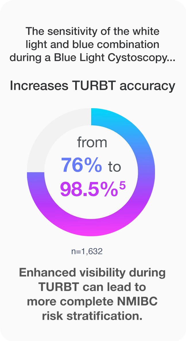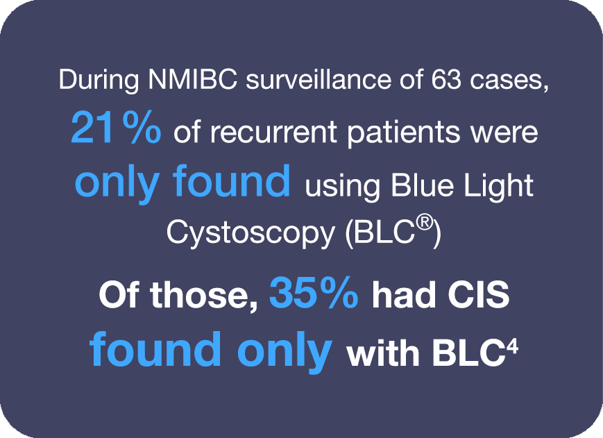 The Blue Light Cystoscopy (BLC®) procedure uses both white and blue light for enhanced visibility of NMIBC tumors.1
